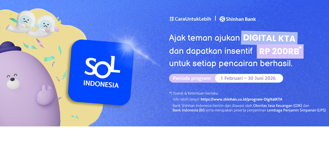 - Program DIGI – KTA Referral diselenggarakan oleh PT Bank Shinhan Indonesia atau disebut “Bank Shinhan Indonesia” dan berlaku sejak tanggal 1 Februari sampai dengan 30 Juni 2026.