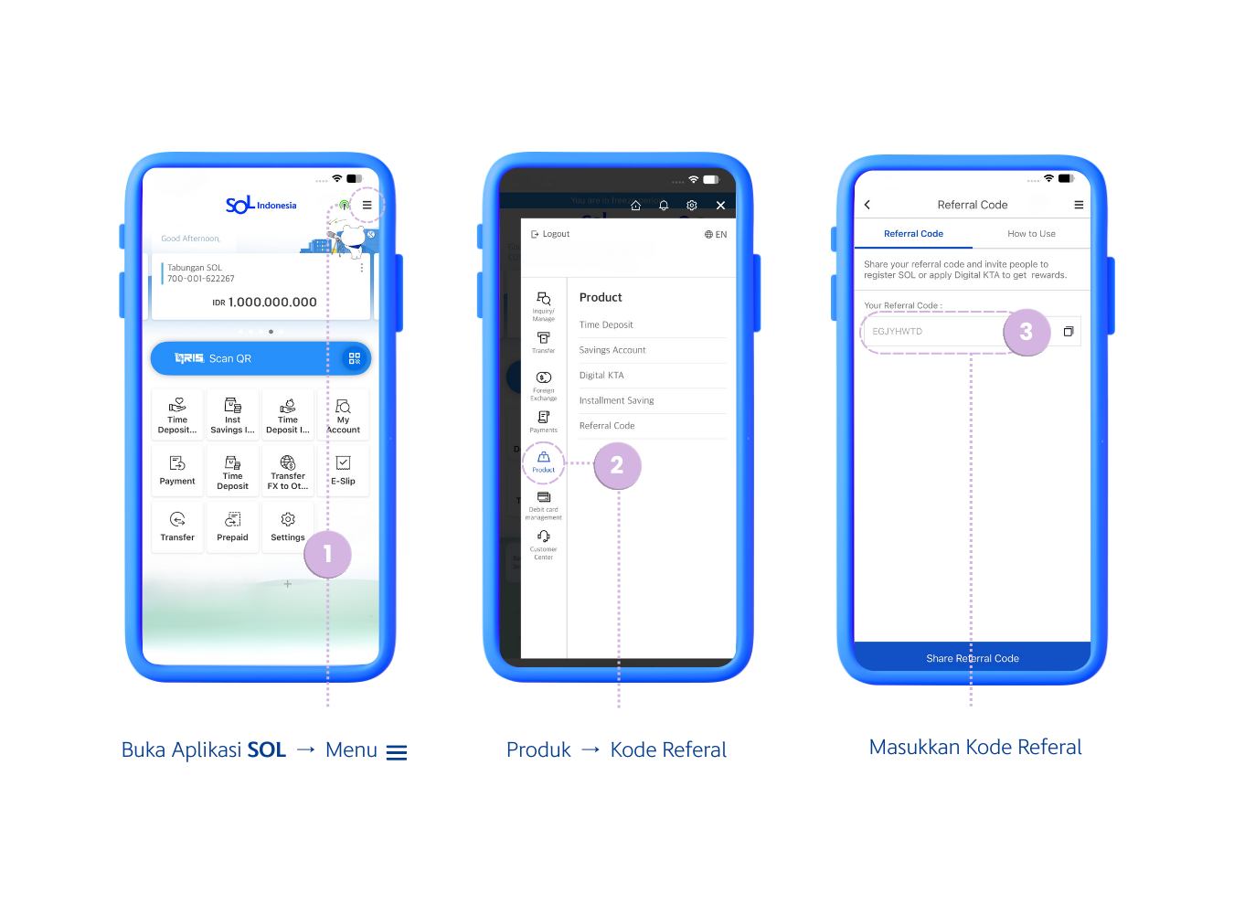 - Referrer akan memperoleh kode referral unik yang tersedia di Aplikasi Mobile Banking SOL Indonesia.